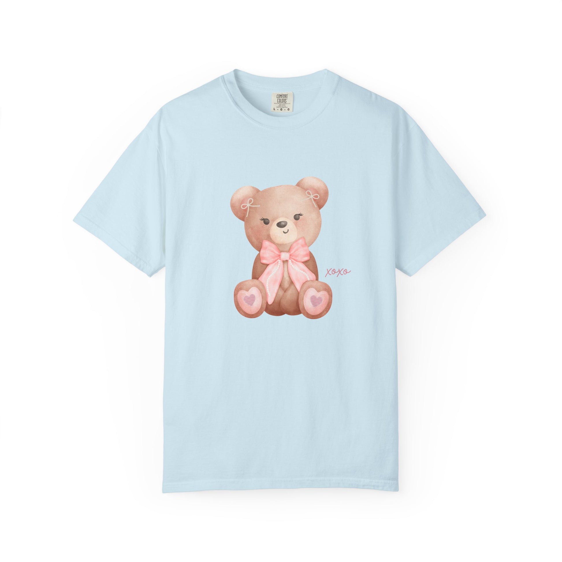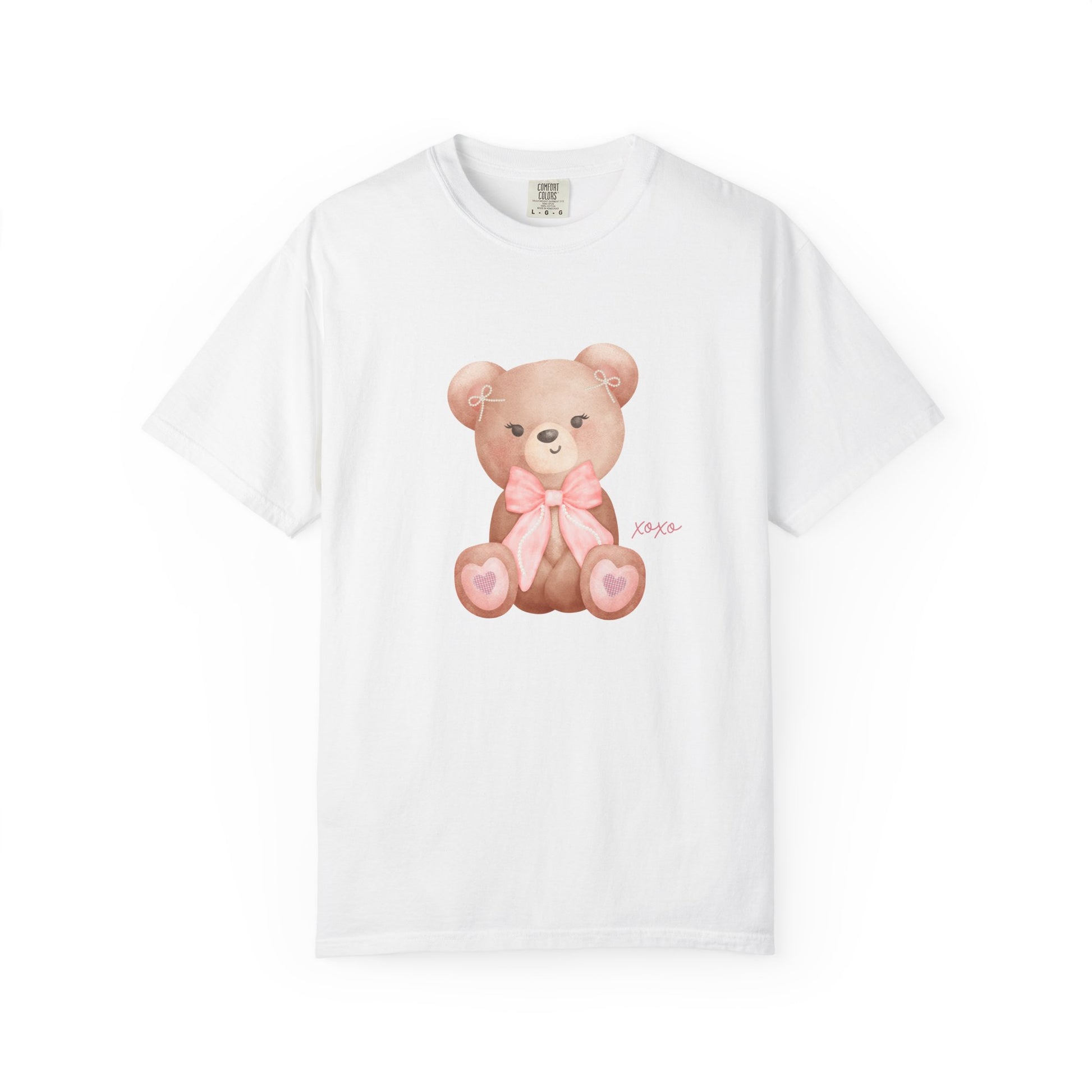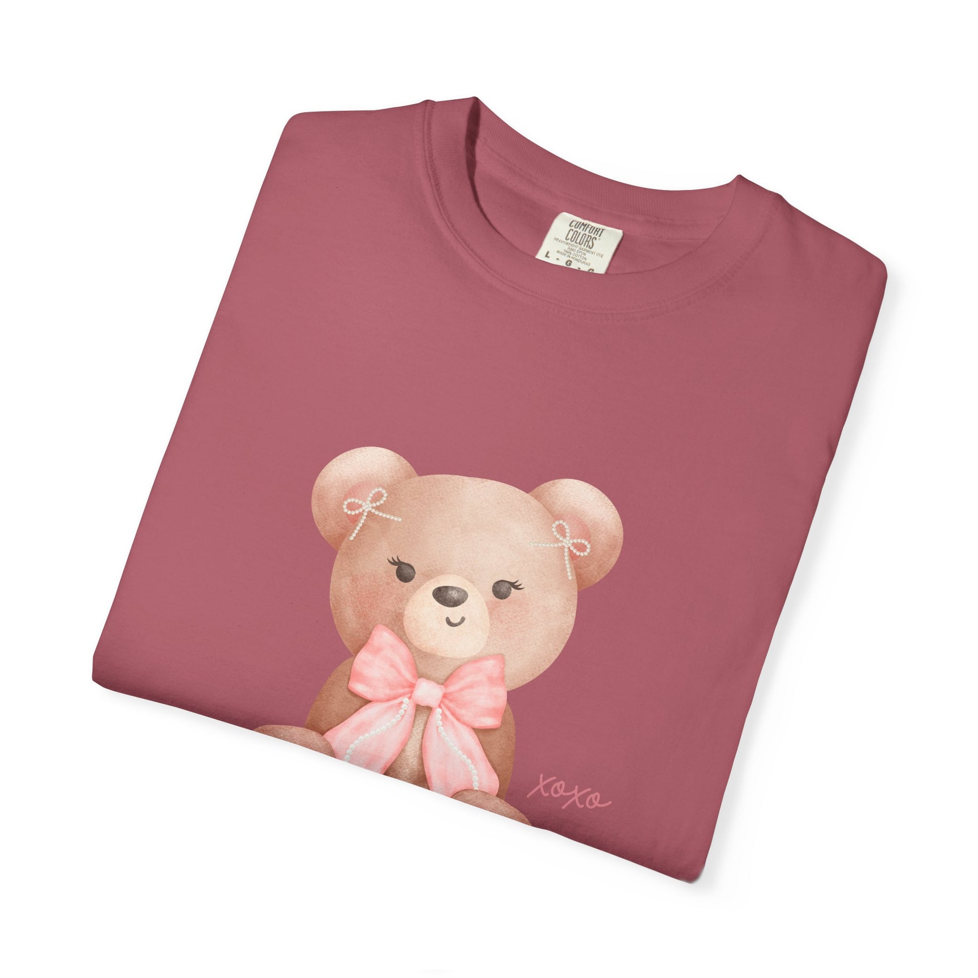 This cutesy and soft t-shirt feels like a warm, familiar hug. A sweet bear with a pink bow and tiny pearl bows tucked into her ears sits gently on the chest, giving the shirt a playful, vintage charm. This relaxed-fit tee layers easily under a cardigan for slow mornings at a café or stands alone during weekend walks to the park. It’s for people who love subtle nostalgia and a dash of whimsy—those who collect small delights and wear them with quiet confidence.